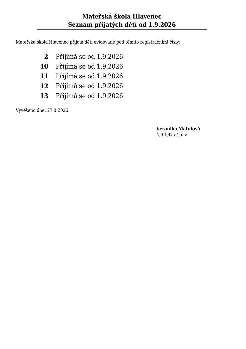 KAPACITA MŠ PRO ŠKOLNÍ ROK 2026/2027 JE NAPLNĚNA.